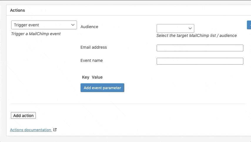 The actions can update internal objects like users and posts with tags, custom fields etc. They can also create new users and posts (of any post type). But actions can be more advanced than that. Using add-ons it’s possible to do advanced integrations with services Slack, Telegram or MailChimp. It’s alos possible to trigger Zaps in Zapier.