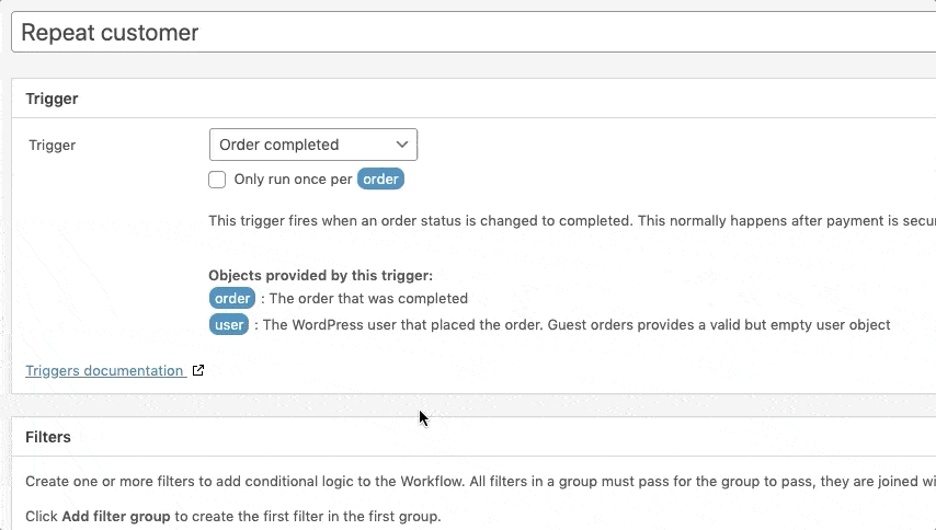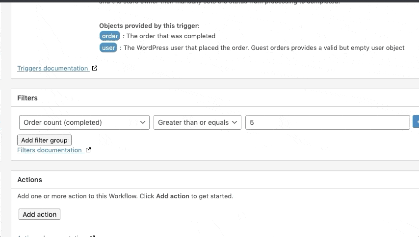 Make your workflows smarter by adding conditional logic, we call them filters and they can be combined with AND/OR. There are over 60 different filters built in. In this animation, we’re adding a filter requiring that the WooCommerce customer must have at least 5 completed orders in our store.