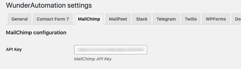 Next, in your WordPress admin dashboard, go to Automations -> Settings. Select the MailChimp tab and paste in your API key;