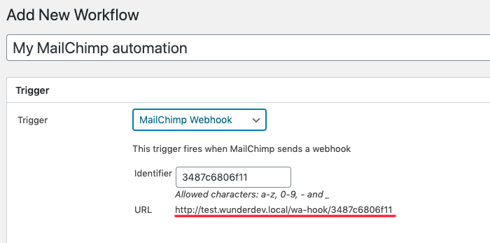 We’re calling our workflow “My MailChimp automation” and we’re selecting to use the “MailChimp Webhook” trigger. Note that as soon as you select this trigger, a random URL will be shown. This is the URL for the webhook. Copy that UR.L.