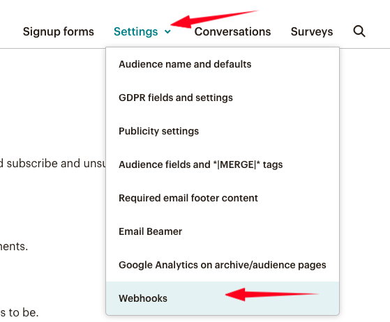In this step, we’re going to head over to MailChimp. Open the MailChimp website in a new web browser and log in to your account. Navigate to the Audience section (top menu) and click to reveal the Settings menu and select “Webhooks”: