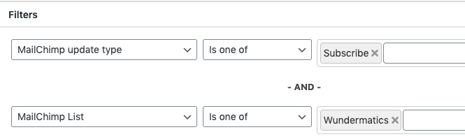 | List | Is one of “[LIST NAME]” | If we have multiple audiences on MailChimp, this filter ensures that we only run our action for the specific list. |