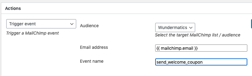 When our WordPress site gets this notification, we will use the MailChimp add-on to catch it into an automation workflow. In that workflow, we will trigger a MailChimp event and send a newly generated coupon code as one of it’s parameters.