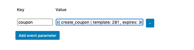 We’ll call our event paramter “coupon” and use a WunderAutomation placeholder to generate a WooCommerce coupon. To help you create this placeholder, find the “create_coupon” parameter on the right hand side of the editor and click it.