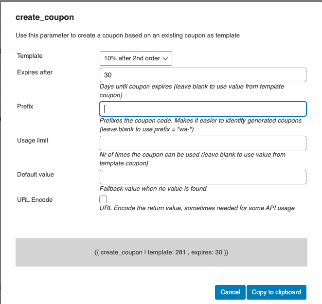 It will popup the parameter placeholder editor. The only fields you must fill in is the “Template” field where you select a previously existing WooCommerce coupon to use as a template. We’ve also decided to set a limit so that the generated coupon in only valid for 30 days.