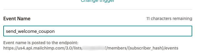 Next, we edit the trigger settings to tell MailChimp the name of the event we’re sending. It’s important to use the exact same name as we defined in step 4 above: