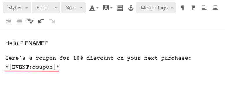 To print out the event parameter in the email, we use the standard MailChimp merge tag syntax using asterisk (*) and pipe ( | ). The keyword to use is EVENT and you tell MallChimp which event parameter field to use by simply typing it. Since our event parameter was named “coupon”, the complete merge tag is: *|EVENT:coupon|*